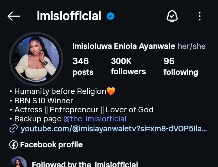 |Winner of the Big Brother Naija Season 10 Show, Imisi Ayanwale has generated several reactions from the public as she hits 300K followers on her official Instagram page. Imisi Ayanwale won the Big Brother Naija Season 10 Show out of a total of 29 housemates that auditioned for the show and got shortlisted and selected to be housemates of the Big Brother Naija Season 10 Show.