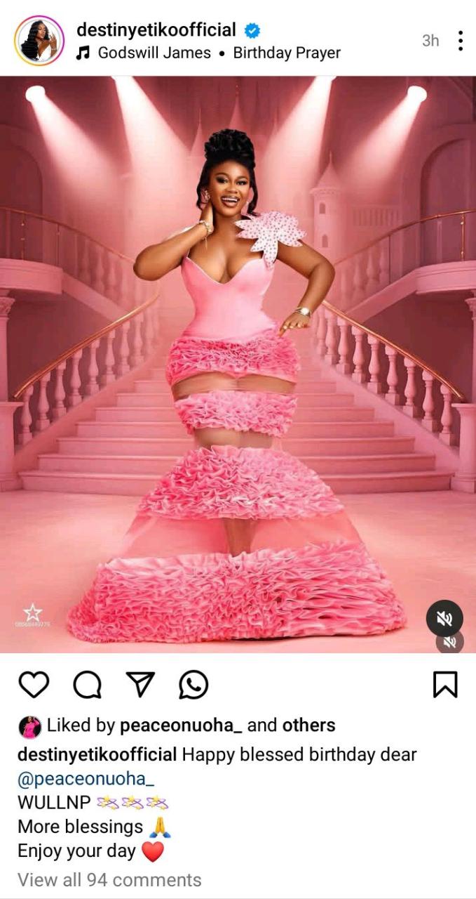 Fellow actress Destiny Etiko also joined in celebrating Peace Onuoha’s special day. She reposted one of the pictures on her official Instagram page with a warm message that read, “Happy blessed birthday dear @peaceonuoha_. WULLNP. More blessings. Enjoy your day.” The acronym WULLNP means “We wish you long life and prosperity,” showing her genuine affection and support for her colleague.