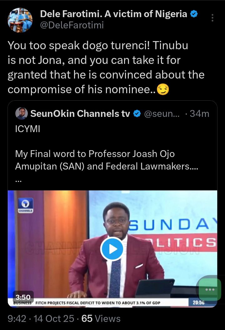 Farotimi’s statement, “Tinubu is not Jona, and you can take it for granted that he is convinced about his nominee,” reflects a critical perspective on the nomination process.