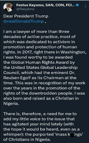 Claims of targeted k!lling of Christians in Nigeria are false — Festus Keyamo says in open letter to Trump