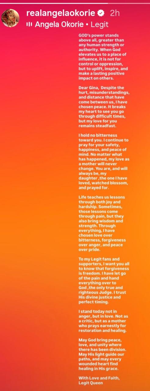 Angela Okorie has spoken out in defense of her junior colleague, Regina Daniels, who is currently experiencing a family crisis. Angela condemned the use of one’s influence to oppress others. She added that she has forgiven Regina for their fight months ago and she called for fair treatment for her Angela wrote: GOD’s power stands above all, greater than human strength or any authority. When God elevates us to a place of influence, it is not for control or oppression, but to uplift inspire, and make a lasting positive impact on others. “Dear Gina, despite the hurt, misunderstandings. and distance that have come between us, I have chosen peace. It breaks my heart to see you go through difficult times, but my love for you remains steadfast. “I hold no bitterness toward you. I continue to pray for your safety, happiness, and peace of mind. No matter what has happened, my love as a mother will never change. You are, and will always be, my daughter, the one l have loved, watched blossom, and prayed for. “Life teaches us lessons through both joy and hardship. Sometimes those lessons come through pain, but they also bring wisdom and strength. Through everything, I have chosen love over bitterness, forgiveness over anger. and peace over pride. “To my Legit fans and supporters, l want you all to know that forgiveness is freedom. I have let go of the pain and hand everything over to God, the only true and righteous Judge. I trust His divine justice and perfect timing. “I stand today not in anger, but in love. Not as a critic, but as a mother who prays earnestly for restoration and healing. May God bring peace love, and unity where there has been division. May His light guide our paths, and may every wounded heart find healing in His grace.” Angela signed off the message, “With Love and Faith”.