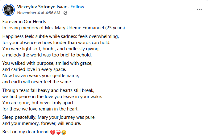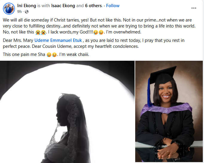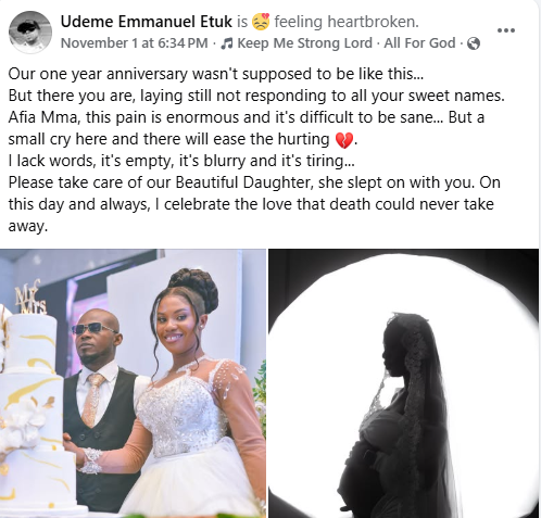 A Nigerian man, Udeme Etuk Emmanuel, has been thrown into mourning following the d3ath of of his 23-year-old wife, Mary, barely a year after their wedding.   The couple got married on November 2, 2024.    It was gathered that Mary d!ed a few days ago after giving birth to their first child. Tragically, the newborn baby also d!ed.   The remains of Mary and the baby were laid to rest on Thursday, November 6, 2025 at Okoyo Community, Ukanafun Local Government Area of Akwa Ibom State.The grieving widow, family members and friends took to Facebook to pay touching tributes to the young woman.  Our one year anniversary wasn’t supposed to be like this. But there you are, laying still not responding to all your sweet names. Afia Mma, this pain is enormous and it’s difficult to be sane… But a small cry here and there will ease the hurting. I lack words, it’s empty, it’s blurry and it’s tiring. Please take care of our Beautiful Daughter, she slept on with you. On this day and always, I celebrate the love that d3ath could never take away, Emmanuel wrote.  A cousin, Ini Ekong, wrote: We will all d!e someday if Christ tarries, yes! But not like this. Not in our prime…not when we are very close to fulfilling destiny…and definitely not when we are trying to bring a life into this world. No, not like this. I lack words, my God!!!!. I’m overwhelmed. Dear Mrs. Mary Udeme Emmanuel Etuk , as you are laid to rest today, I pray that you rest in perfect peace. Dear Cousin Udeme, accept my heartfelt condolences. This one pain me Sha. I’m weak chaii. Fon Felix wrote: “BEAUTY FOR ASHES. Got married at age 22. Would have begun motherhood at age 23. Unfortunately fate says no. Just a few days to celebrate their One year Marriage Anniversary, the cold hands of death snatched her with the new born baby. Late Mary Udeme Emmanuel was a beauty to behold. So sad it happened this way. Today the remains of Late Mary and the baby were committed to mother Earth at Okoyo Community, Ukanafun LGA Akwa Ibom. We’ve registered our heartfelt condolences to the husband, Mr Udeme Emmanuel Etuk the immediate and Extended Etuk’s family. It’s surely a trying and difficult time to imagine. May God Forbid! Life is indeed a glaring stage: for no one knows when, where and how to bow out.”      The post This pain is enormous – Nigerian man mourns as his 23-year-old wife and baby d!e during delivery few days to their one year wedding anniversary appeared first on Linda Ikeji Blog.
