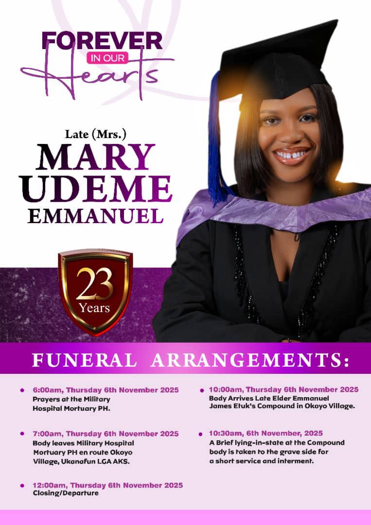 A Nigerian man, Udeme Etuk Emmanuel, has been thrown into mourning following the d3ath of of his 23-year-old wife, Mary, barely a year after their wedding.   The couple got married on November 2, 2024.    It was gathered that Mary d!ed a few days ago after giving birth to their first child. Tragically, the newborn baby also d!ed.   The remains of Mary and the baby were laid to rest on Thursday, November 6, 2025 at Okoyo Community, Ukanafun Local Government Area of Akwa Ibom State.The grieving widow, family members and friends took to Facebook to pay touching tributes to the young woman.  Our one year anniversary wasn’t supposed to be like this. But there you are, laying still not responding to all your sweet names. Afia Mma, this pain is enormous and it’s difficult to be sane… But a small cry here and there will ease the hurting. I lack words, it’s empty, it’s blurry and it’s tiring. Please take care of our Beautiful Daughter, she slept on with you. On this day and always, I celebrate the love that d3ath could never take away, Emmanuel wrote.  A cousin, Ini Ekong, wrote: We will all d!e someday if Christ tarries, yes! But not like this. Not in our prime…not when we are very close to fulfilling destiny…and definitely not when we are trying to bring a life into this world. No, not like this. I lack words, my God!!!!. I’m overwhelmed. Dear Mrs. Mary Udeme Emmanuel Etuk , as you are laid to rest today, I pray that you rest in perfect peace. Dear Cousin Udeme, accept my heartfelt condolences. This one pain me Sha. I’m weak chaii. Fon Felix wrote: “BEAUTY FOR ASHES. Got married at age 22. Would have begun motherhood at age 23. Unfortunately fate says no. Just a few days to celebrate their One year Marriage Anniversary, the cold hands of death snatched her with the new born baby. Late Mary Udeme Emmanuel was a beauty to behold. So sad it happened this way. Today the remains of Late Mary and the baby were committed to mother Earth at Okoyo Community, Ukanafun LGA Akwa Ibom. We’ve registered our heartfelt condolences to the husband, Mr Udeme Emmanuel Etuk the immediate and Extended Etuk’s family. It’s surely a trying and difficult time to imagine. May God Forbid! Life is indeed a glaring stage: for no one knows when, where and how to bow out.”      The post This pain is enormous – Nigerian man mourns as his 23-year-old wife and baby d!e during delivery few days to their one year wedding anniversary appeared first on Linda Ikeji Blog.