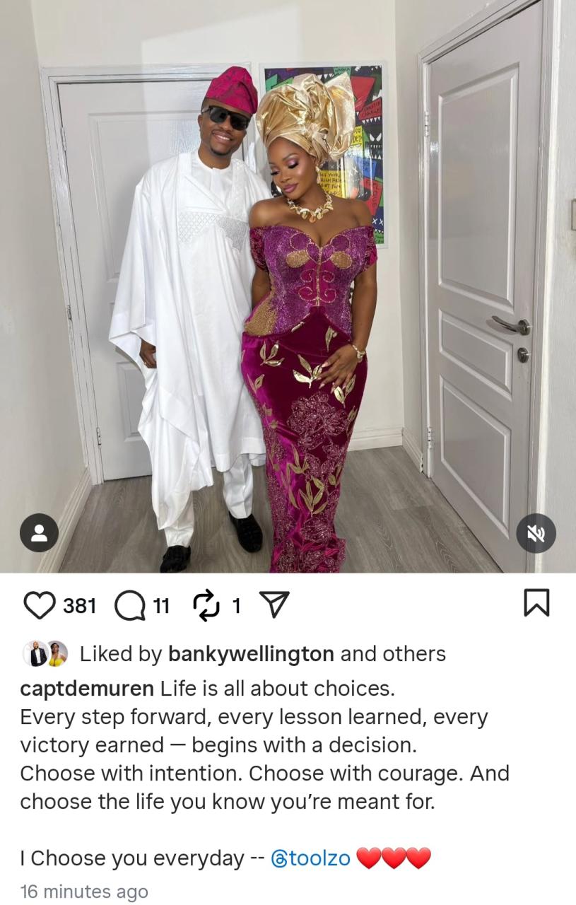 “I choose you everyday” Captain Demuren celebrates wife Toolz