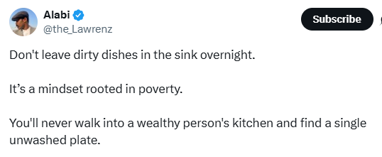 Nigerian media expert, Alabi Lawrence, has said that the habit of leaving dirty dishes in the sink overnight is rooted in poverty.  Don’t leave dirty dishes in the sink overnight. Its a mindset rooted in poverty. You’ll never walk into a wealthy person’s kitchen and find a single unwashed plate, he wrote in a post on Friday.    The post Don’t leave dirty dishes in the sink overnight. Its a mindset rooted in poverty – Media expert, Alabi Lawrence says appeared first on Linda Ikeji Blog.