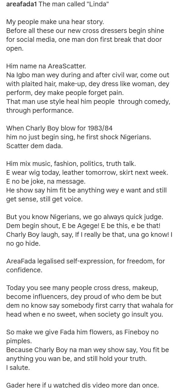 Charley Boy, aka Area Fada, has said he paved the way for cross dressers to express themselves in Nigeria.  The entertainer, whose real name is Charles Oputa, shared a video of himself wearing makeup and acting feminine. He introduced his character as his alter ego “Linda”. In the caption, he wrote: “The man called ‘Linda’. “My people make una hear story. Before all these our new cross dressers begin shine for social media, one man don first break that door open. “Him name na AreaScatter. Na Igbo man wey during and after civil war, come out with plaited hair, make-up, dey dress like woman, dey perform, dey make people forget pain. “That man use style heal him people through comedy, through performance. “When Charly Boy blow for 1983/84 him no just begin sing, he first shock Nigerians. Scatter dem dada. “Him mix music, fashion, politics, truth talk. E wear wig today, leather tomorrow, skirt next week. “E no be joke, na message. He show say him fit be anything wey e want and still get sense, still get voice. “But you know Nigerians, we go always quick judge. “Dem begin shout, E be Agege! E be this, e be that! “Charly Boy laugh, say, If I really be that, una go know! I no go hide. “AreaFada legalised self-expression, for freedom, for confidence. “Today you see many people cross dress, makeup, become influencers, dey proud of who dem be but dem no know say somebody first carry that wahala for head when e no sweet, when society go insult you. “So make we give Fada him flowers, as Fineboy no pimples. Because Charly Boy na man wey show say, You fit be anything you wan be, and still hold your truth. I salute.  See video below.      View this post on Instagram           A post shared by Lindaikejiblog (@lindaikejiblogofficial) The post “Before these cross dressers began trending, I already broke that door open” Charley Boy says as he introduces his alter ego “Linda” appeared first on Linda Ikeji Blog.