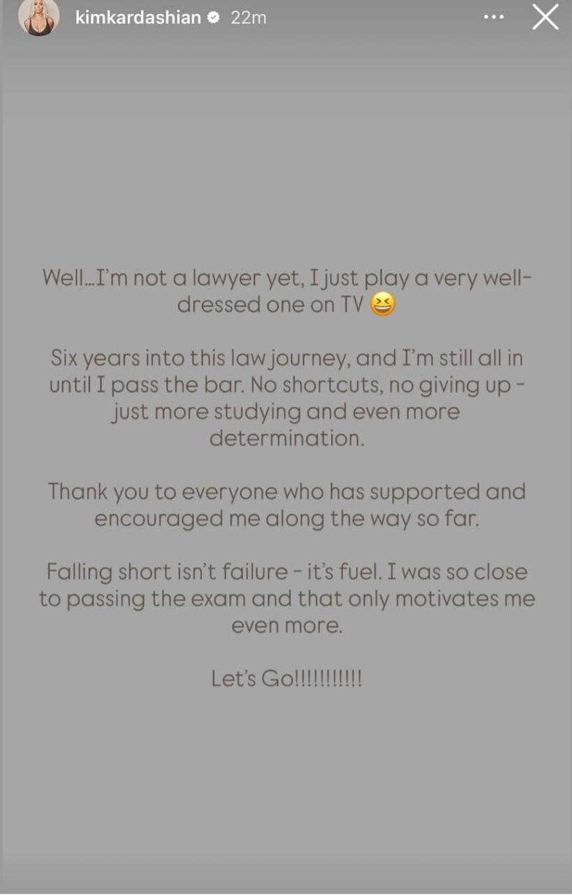 Kim Kardashian failed at another attempt at becoming a lawyer. Months after taking the California bar exam on July 29 and July 30, the SKIMS founder and reality star, 45, revealed her results on Saturday, Nov. 8. In a candid Instagram Stories post, Kim shared that she failed to pass the exam but is still determined to achieve her goal. “Well…I’m not a lawyer yet, I just play a very well-dressed one on TV,” she wrote. “Six years into this law journey, and I’m still all in until I pass the bar. No shortcuts, no giving up – just more studying and even more determination.” “Thank you to everyone who has supported and encouraged me along the way so far. Failing short isn’t failure – it’s fuel. I was so close to passing the exam and that only motivated me even more. Let’s go!” she added.
