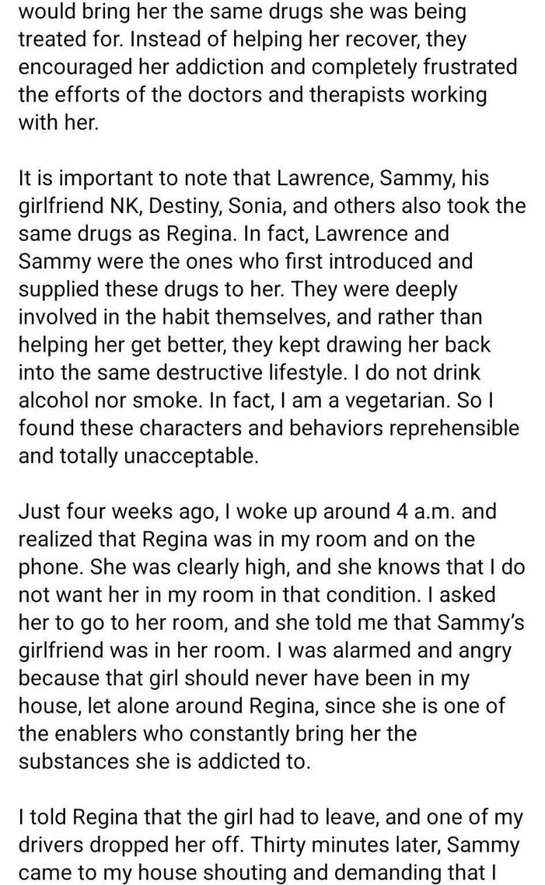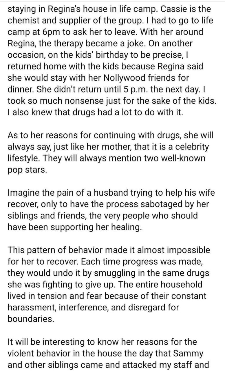 Ned Nwoko has responded with his side of the story after his youngest wife Regina Daniels and her family accused him of sending thugs to beat her up. Ned denied the domestic violence allegations and alleged that the video released showing Regina alleging violence was filmed at his house when he was not around and it was all a “Nollywood scenario” orchestrated by Regina’s siblings. Ned went on to claim that Regina takes drugs alongside her elder brothers, Lawrence and Sammy, Sammy’s girlfriend NK, Regina’s sister Destiny, and Sonia (believed to be actress Sonia Ogala who has been calling out Ned for arresting Sammy). Ned alleged Regina has been receiving treatment for drug addiction and the doctor advised him to keep her away from those who make her relapse. He said he tried to keep her away from them but her brother Sammy, her sister Destiny, and some Nollywood starts like Sonia (Ogala?) and Uche Montana would force their way into the house to supply Regina with drugs. “They encouraged her addiction and completely frustrated the efforts of the doctors and therapists working with her,” Ned claimed. He went on to accuse Sammy of coming to the house to harrass his staff and security whenever they refused to let Regina leave the house. Ned said he set Sammy up financially, bought him music equipments and got him a furnished apartment in Abuja. However, he claims Sammy failed to get his act together. The politician also pointed accusing fingers at Regina’s mother, Rita Daniels, insinuating she is complicit in her children’s alleged behaviour. “As to her reasons for continuing with drugs, she will always say, just like her mother, that it is a celebrity lifestyle. They will always mention two well-known pop stars,” Ned wrote. He added that he endured so much in his marriage to Regina for the sake of their children. Ned reiterated that Regina and her brother Sammy have a drug problem and need to undergo rehabilitation. He did not address the issue of Sammy’s arrest and continued refusal to grant him access to his family and lawyer.