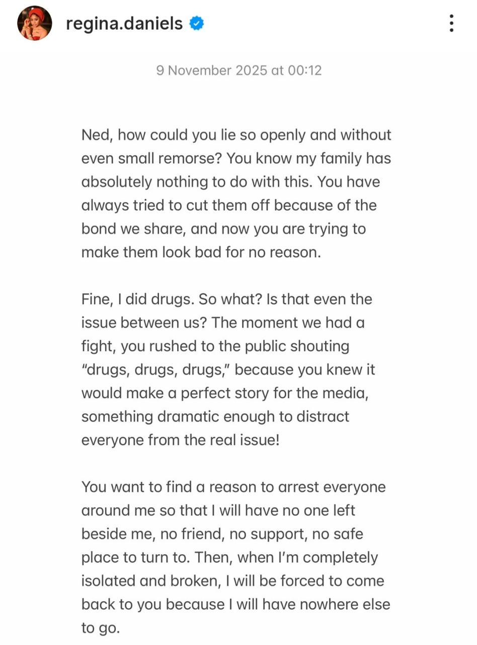 Why don’t you tell them how you force yourself on me when I say no. Why don’t you tell them that all you wives are on drugs?” Regina Daniels responds with newer allegations after Ned Nwoko claimed she and her siblings are drug users