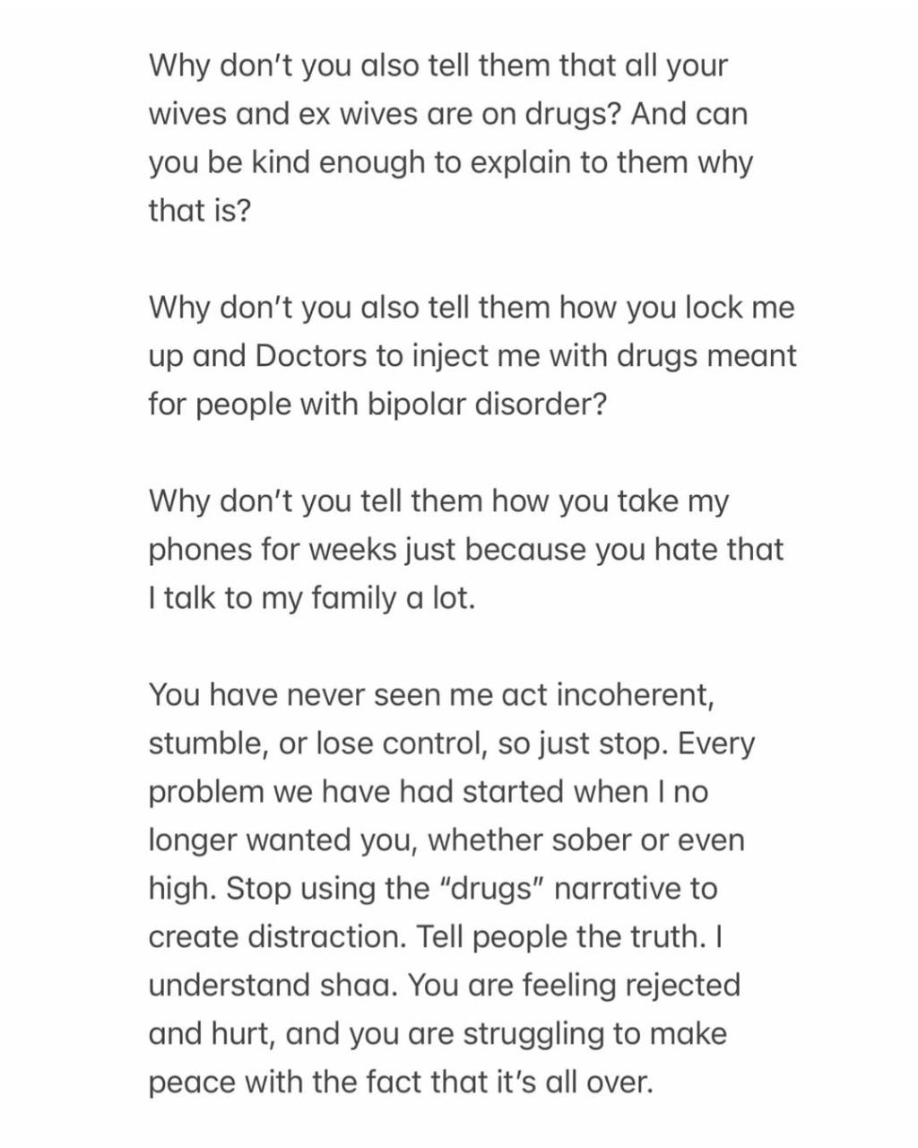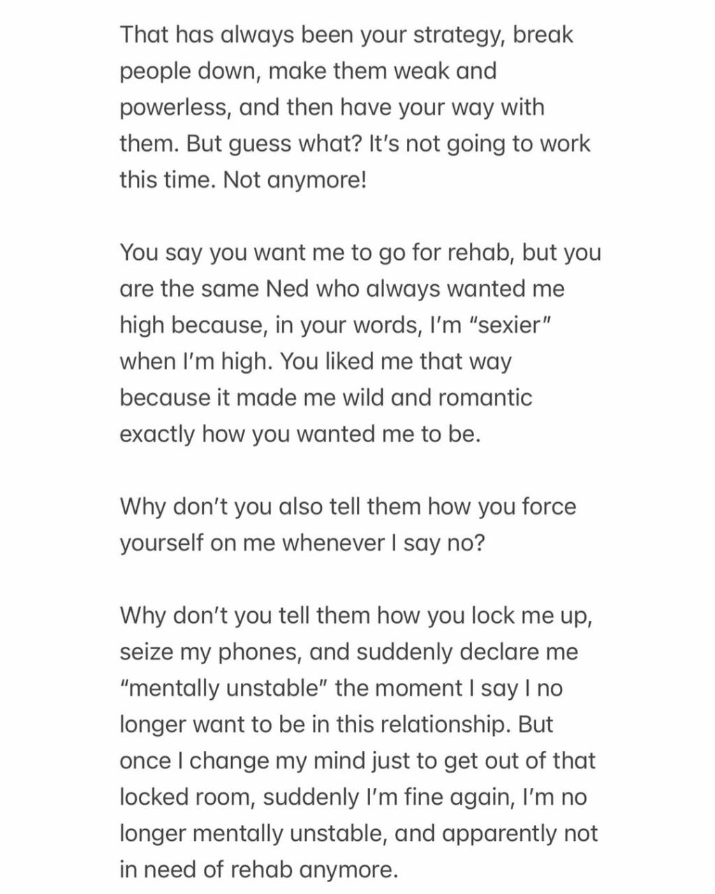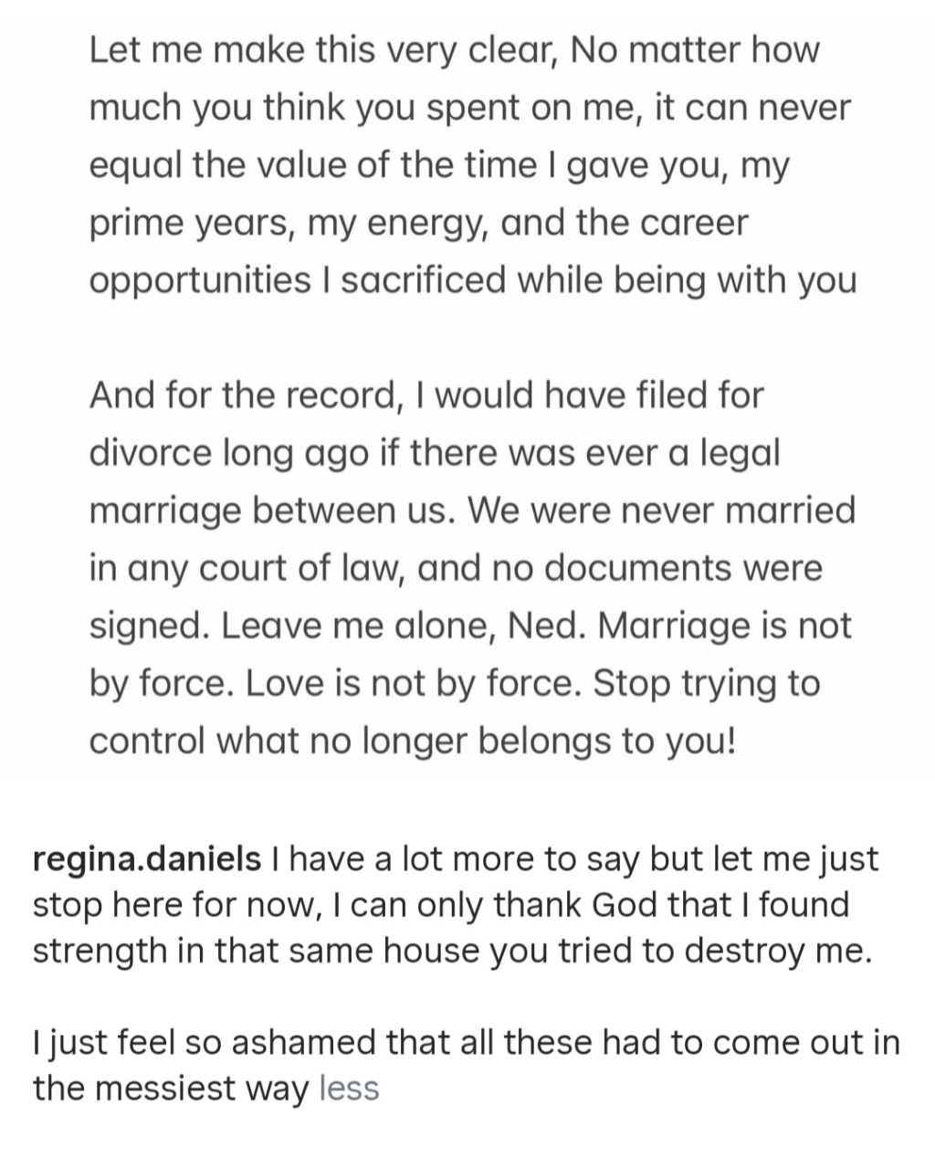 Actress Regina Daniels has made some damning accusations against her estranged husband, Ned Nwoko, after he released a statement claiming she and her siblings are drug addicts. Regina accused Ned of lying in her latest response to him. She alleged she would have divorced Ned a long time ago. However, she claims whenever she says she is no longer interested in the relationship, he isolates her, seizes her phone, locks her up, and gets doctors to inject her with drugs meant for those with bipolar disorder. However, she alleges whenever she finally agrees to stay in the relationship, Ned restores her freedom and suddenly stops claiming she’s mentally unstable. She also accused Ned of forcing himself on her even when she says no. She admitted she takes drugs but alleged that Ned was the one who encouraged her to take it because, according to him it makes her “sexier”, “wild”, and “romantic”, “exactly how you wanted me to be.” Regina also charged Ned to tell the world why all this wives and ex-wives are on drugs. See her full post below.  The post Why don’t you tell them how you force yourself on me when I say no. Why don’t you tell them that all you wives are on drugs?” Regina Daniels responds with newer allegations after Ned Nwoko claimed she and her siblings are drug users appeared first on Linda Ikeji Blog.