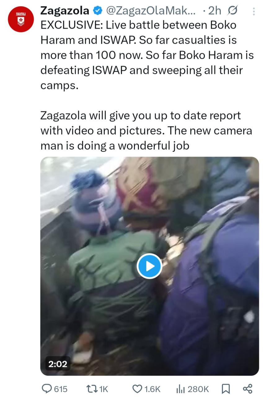 Scores of terrorists have reportedly been k!lled as Boko Haram fighters engaged in a fierce battle with Islamic State West Africa Province (ISWAP). According to a report by counter-insurgency expert and security analyst Zagazola Makama on Monday, Nov. 10, Boko Haram appears to be defeating ISWAP, overrunning several of their camps. The existing rivalry between the Jihadist duo led to a full-scale territorial warfare along riverine settlement routes in Abadam and Kukawa Local Government Areas of Borno State. Zagazola Makama revealed that the fight took a new turn for the worse when Boko Haram launched a fierce coordinated assault on its rival faction, ISWAP. ISWAP fighters were forced to abandon their river camps, scrambling for their lives. A source confirmed that JAS deployed several motorised watercraft in a multi-axis assault, overrunning ISWAP clusters and pushing surviving fighters off the island perimeter into mainland hideouts around Ali Jillimari, Metele, Kangarwa, and Gudumbali in northern Borno. A video shared online shows the terrorists screaming Allahu Akbar as they fired shots from different boats while speeding along the water way.