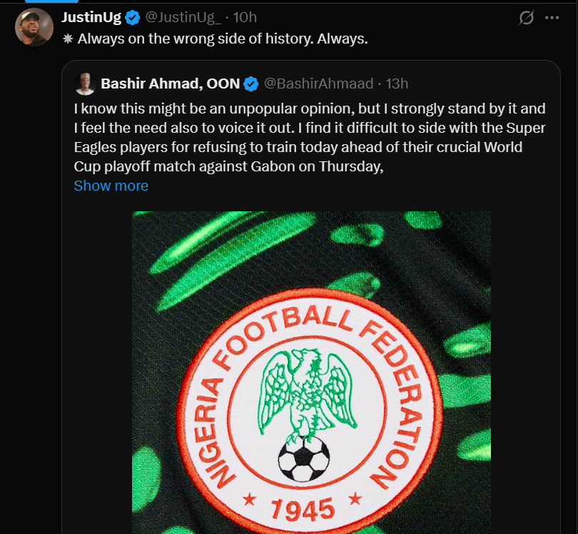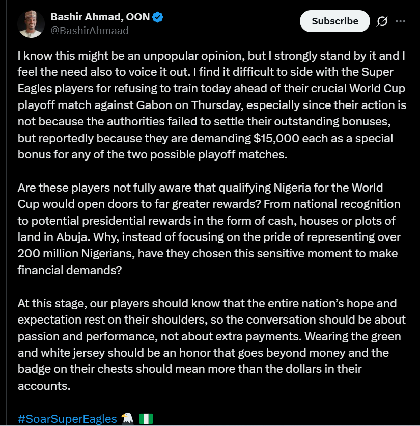 Comedian Justin has taken a swipe at former presidential aide, Bashir Ahmad, following his criticism of the Super Eagles players who reportedly boycotted training ahead of their crucial World Cup playoff clash against Gabon. Ahmad had expressed disapproval of the players decision, describing it as difficult to support since their action was reportedly linked to a demand for $15,000 each as a special bonus for the two possible playoff matches. He wrote: I know this might be an unpopular opinion, but I strongly stand by it and I feel the need also to voice it out. I find it difficult to side with the Super Eagles players for refusing to train today ahead of their crucial World Cup playoff match against Gabon on Thursday especially since their action is not because the authorities failed to settle their outstanding bonuses, but reportedly because they are demanding $15,000 each as a special bonus for any of the two possible playoff matches. Ahmad further argued that the players should focus on national pride rather than financial demands, saying that qualifying for the World Cup would bring far greater rewards. Wearing the green and white jersey should be an honor that goes beyond money, he added.