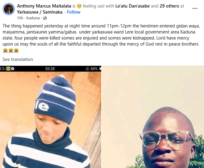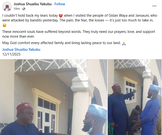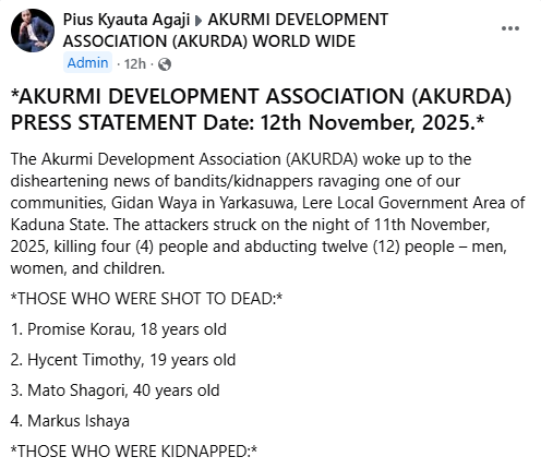 Suspected bandits have k!lled four persons in Gidan Waya and Jansauni communities under Yarkasuwa ward, Kurama Chiefdom in Lere Local Government Area of Kaduna State. It was gathered that the gunmen who attacked the communities on Tuesday night, November 11, 2025, also abducted 12 persons, including ECWA pastor, Rev Istifanus Dungu. The National PRO of Akurmi Development Association (AKURDA), Pius Kyauta Agaji, confirmed the incident in a statement on Wednesday. The Akurmi Development Association (AKURDA) woke up to the disheartening news of bandits/kidnappers ravaging one of our communities, Gidan Waya in Yarkasuwa, Lere Local Government Area of Kaduna State, the statement read. “The attackers struck on the night of 11th November, 2025, k!lling four (4) people and abducting twelve (12) people men, women, and children. “Those who were shot to death include: Promise Korau, 18, Hycent Timothy, 19, Mato Shagori, 40, and Markus Ishaya. “Those who were kidnapped are: Habibu Yahaya, 42, Love Markus, 38, Mummy Markus, 49, 4. Catherine Shitu, 40, Ibrahim Bagobari, 46, John Ibrahim, 15, Rev Istifanus Dungu, 58, Christiana Dungu, 14, Prince Dungu, 13, Miss Dauda, Mrs Rev Danbala Inuwa, 38. “AKURDA strongly condemns this brutal attack and kidnapping of our people who were in their night sleep. “We therefore call on: – The Lere Local Government Chairman – Security agencies – Our Executive Governor of Kaduna State, Sen. Uba Sani to come to our rescue, bring all perpetrators to book, and deploy security personnel around Gidan Waya community. We also urge our people to remain vigilant. May the souls of those killed rest in peace, and we pray for the safe return of the abducted. We demand justice!