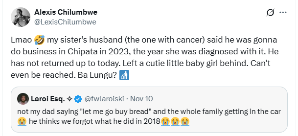 A Zambian journalist, Alexis Chilumbwe, has narrated how his sister’s husband disappeared after she was diagnosed with cancer. According to Chilumbwe, his brother-in-law had claimed he was going to another city in Zambia for business in 2023 but never returned till date.  My sister’s husband (the one with cancer) said he was gonna do business in Chipata in 2023, the year she was diagnosed with it. He has not returned up to today. Left a cutie little baby girl behind. Can’t even be reached. Ba Lungu, he wrote.  The journalist shared the story while reacting to a post by one Laroi.  “Not my dad saying “let me go buy bread” and the whole family getting in the car. He thinks we forgot what he did in 2018,” Laroi wrote.   The post He went to another city for “business” and never returned – Man reveals that his sister’s husband disappeared after she was diagnosed with cancer appeared first on Linda Ikeji Blog.