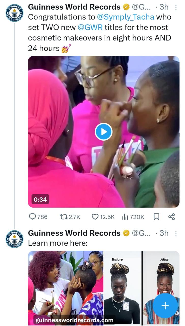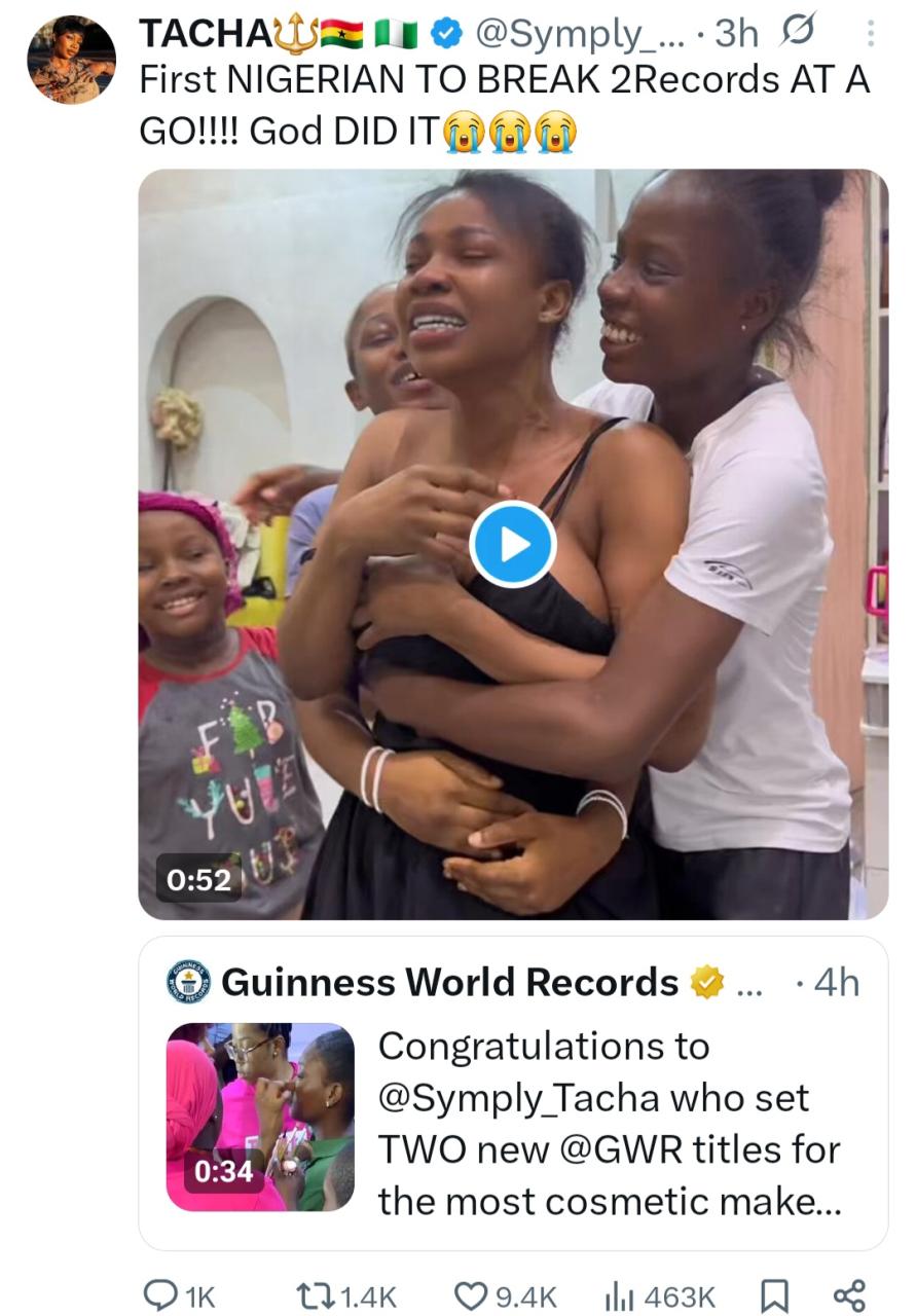 BBNaija star, Tacha could not hide her emotions after Guinness World Records officially confirmed that she has broken two world records. GWR tweeted: “Congratulations to @Symply_Tacha who set TWO new @GWR titles for the most cosmetic makeovers in eight hours AND 24 hours.”  Tacha, who has been waiting for weeks for the confirmation, shared a video of her candid reaction after she got the news. The reality star is seen crying while her loved ones, including her daughter, surrounded her. Expressing her excitement on X, Tacha wrote: “First NIGERIAN TO BREAK 2Records AT A GO!!!! God DID IT.”  Watch video below.      View this post on Instagram           A post shared by Lindaikejiblog (@lindaikejiblogofficial) The post Reality star, Tachas emotional reaction as Guinness World Record officially confirms she has broken 2 world records (video) appeared first on Linda Ikeji Blog.