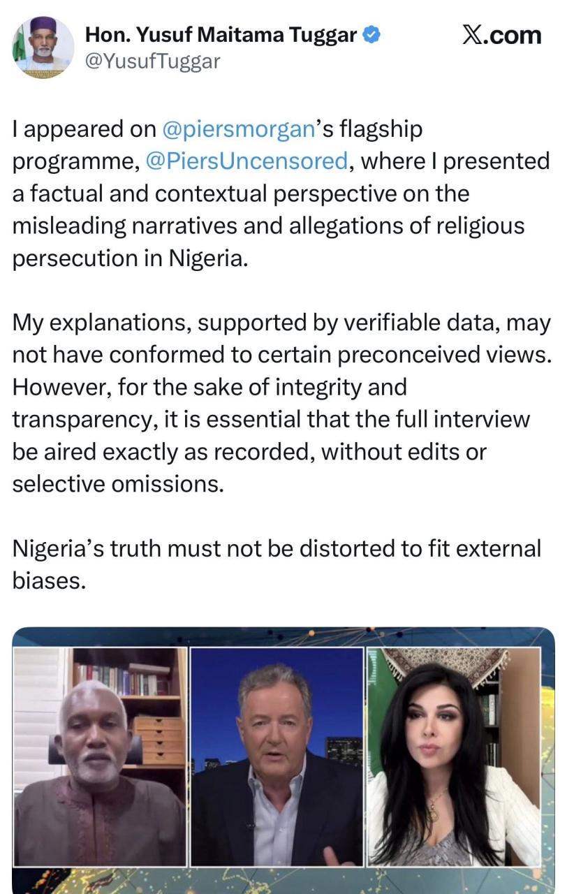 British broadcaster Piers Morgan has fired back at Nigerias Minister of Foreign Affairs, Yusuf Maitama Tuggar, after the minister publicly insisted that his full interview on alleged Christian persecution in Nigeria must be aired without edits. Tuggar had earlier taken to X to say he appeared on Piers Morgan Uncensored to give a factual and contextual perspective on the misleading narratives and allegations of religious persecution in Nigeria. In the same post, he warned that for the sake of integrity and transparency, it is essential that the full interview be aired exactly as recorded, without edits or selective omissions, adding that Nigerias truth must not be distorted to fit external biases.