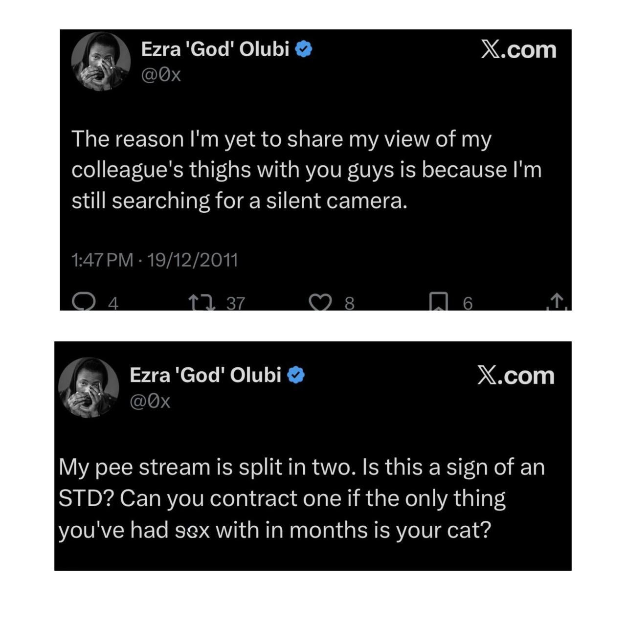 Fresh screenshots of old tweets linked to Paystack co founder Ezra Olubi have continued to spark outrage, as more disturbing posts resurfaced online.  The newly circulated tweets show the tech entrepreneur making shocking claims about having HIV and Hepatitis, while others contain graphic comments about s3xual activity with his cat. In one of the tweets, Olubi claimed he had been diagnosed with both HIV and Hepatitis B after going to the hospital for a general checkup. Several other posts that resurfaced appear to show him making unsettling jokes about bestiality, including statements implying s3xual contact with a cat and inappropriate s3xual remarks about coworkers and young girls. The controversy follows closely on the heels of another scandal after his breakup with one of the bisexual women in his polycule, a relationship involving two women who were also dating each other. As more screenshots emerge, many social media users are calling for accountability, describing the posts as alarming and unacceptable. The situation has ignited widespread debate, with many Nigerians questioning how such tweets went unnoticed for years and expressing shock that they came from a prominent figure in the countrys tech ecosystem. See the tweets below.. The post More tweets where Paystack co-founder Ezra Olubi admittedhaving HIV and Hepatitis and also sleep!ng with his cat surfaces appeared first on Linda Ikeji Blog.