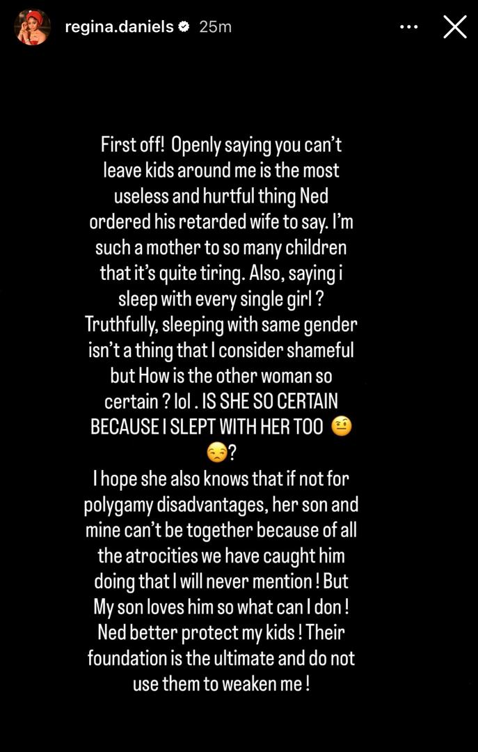Regina Daniels has responded to her co-wife, Laila Charani, who last night released a statement on social media in which she made some allegations against Regina. In her statement, Laila accused Regina of introducing her and other women in their husband’s house as well as Regina’s younger sister, Destiny, to hard drugs, She also accused Regina of sleeping with women. Read here. Regina has now responded to Laila. The mum of two said dismissed Laila’s claim that it is unsafe to have children around her as she might expose them to bad habits such as drug abuse. She also stated that she doesn’t consider sleeping with same gender as a shameful act’. She asked how Laila so certain that she sleeps with women as well.Is she so certain because I slept with her too”Regina also stated that Laila should know that if not for polygamy, her sons and Laila’s son cannot be in the same space because of the atrocities he has been caught in the past committing. She concluded by asking her estranged husband, Ned, to protect her sons, who are in his custody, and not use them to weaken her. Read her post below