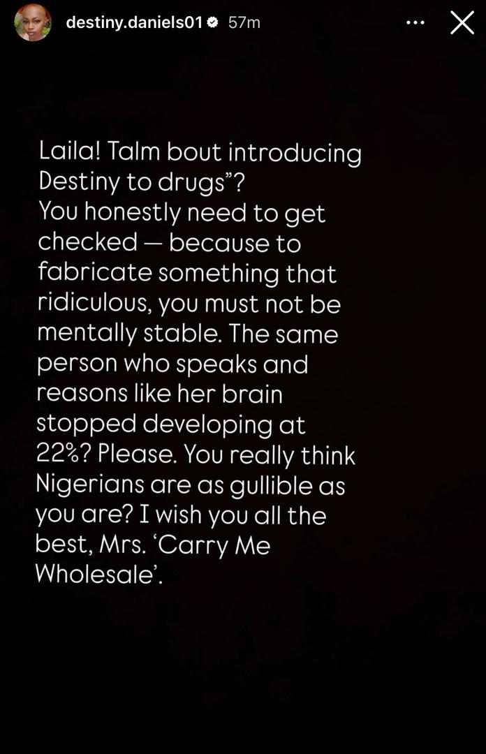 Destiny Daniels, the younger sister of actress Regina Daniels, has clapped back at Laila Charani, the 5th wife of lawmaker, Ned Nwoko, who accused her sister, Regina Daniels, of introducing women including herself, Destiny, to drug abuse.Laila in a statement released on her page last night, accused Regina of abusing hard drugs and introducing women including her younger sister, Destiny, to drugs.Destiny has now responded to the claim. According to Destiny, Laila must be retarded for making such a claim.