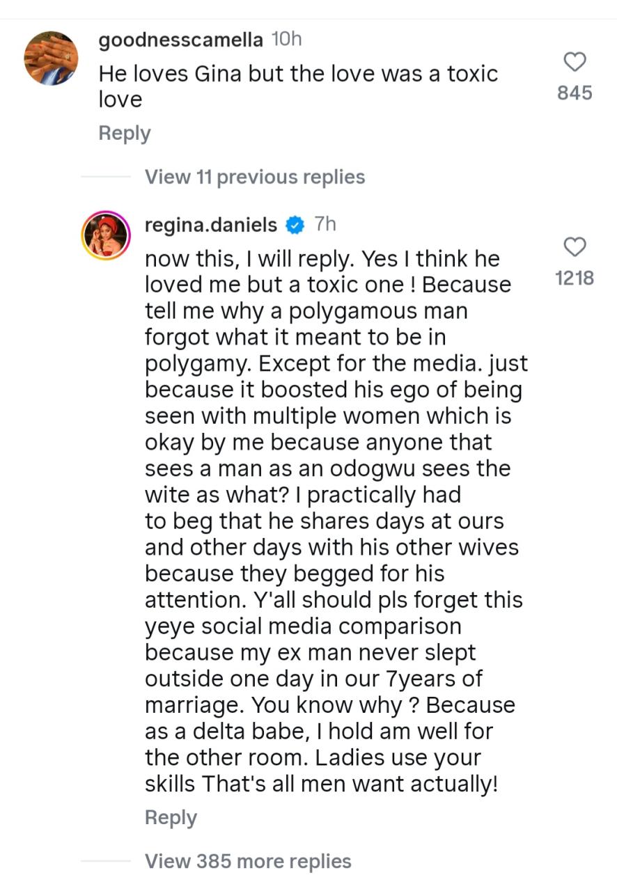 Regina Daniels has said that her estranged husband Ned Nwoko loved her to the point of toxicity and that he went as far as ignoring his other wives because of her. Regina said this in response to an Instagram user who said Ned “loves” Regina but the love was “toxic”. Regina agreed with the commenter. In her response, Regina stated that in the 7 years they spent together, Ned never slept outside for one day. She added that he forgot what it meant to be a man in a polygamous marriage and ignored his other wives for her. Regina said she was the one who begged him to spend time with his other wives when they started complaining. Regina wrote: “Now this, I will reply. Yes I think he loved me but a toxic one! “Because tell me why a polygamous man forgot what it meant to be in polygamy. Except for the media. Just because it boosted his ego of being seen with multiple women which is okay by me because anyone that sees a man as an odogwu sees the wite (sic) as what? “I practically had to beg that he shares days at ours and other days with his other wives because they begged for his attention. “Y’all should pls forget this yeye social media comparison because my ex man never slept outside one day in our 7years of marriage. You know why ? Because as a delta babe, I hold am well for the other room. Ladies use your skills That’s all men want actually.”
