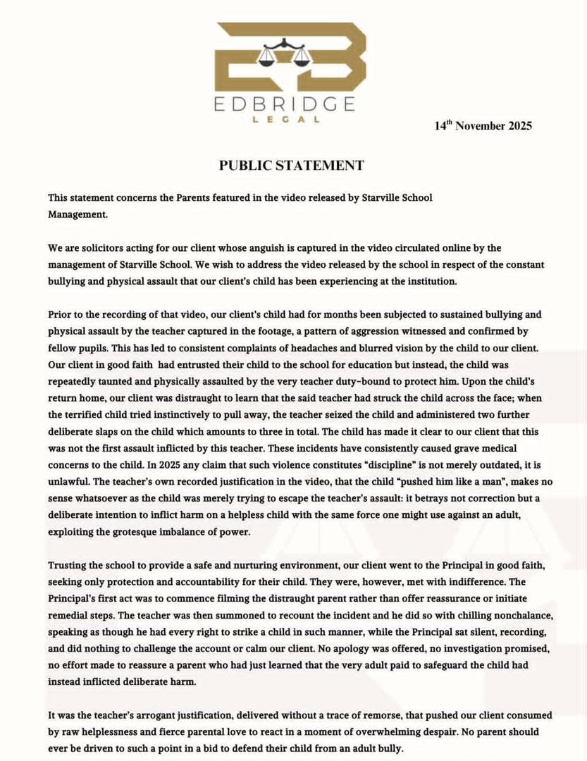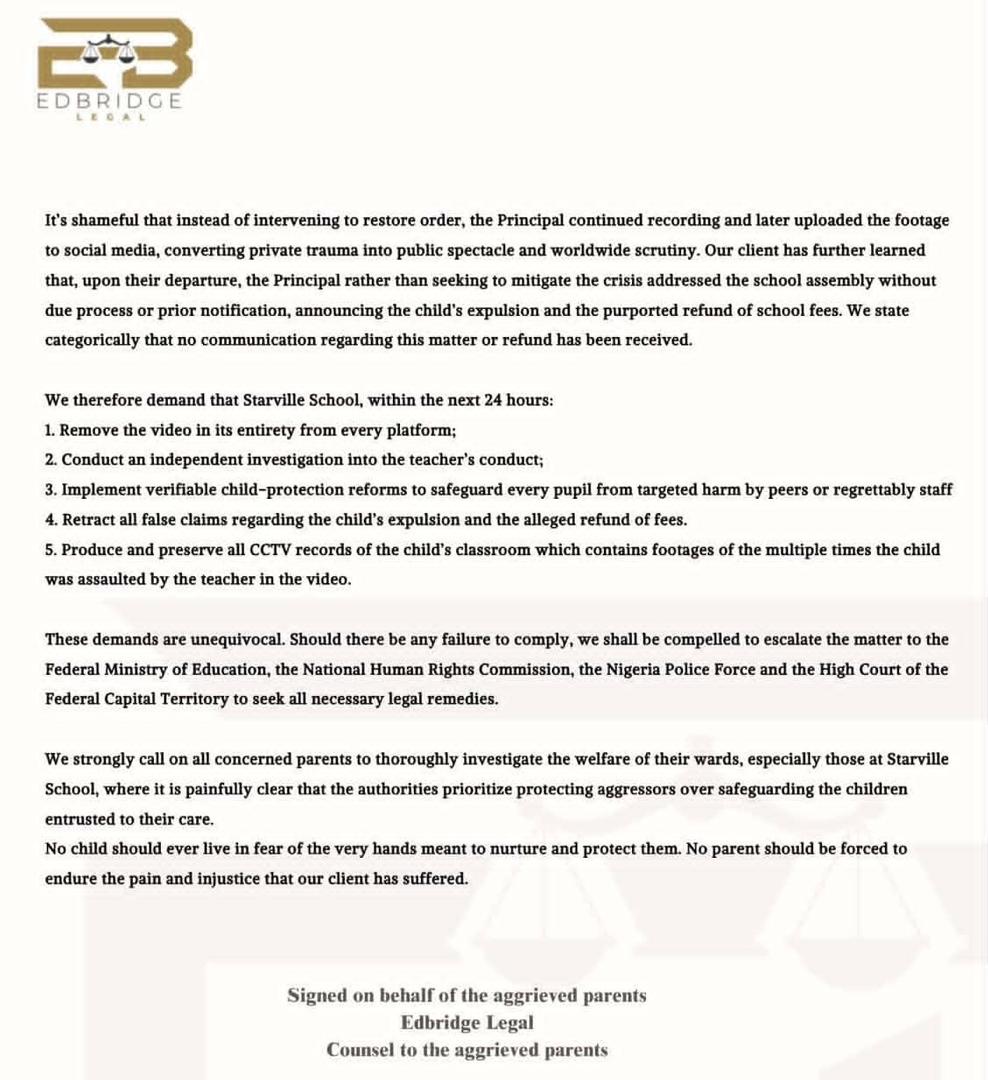 The parents of the pupil who was allegedly ass@ulted by his teacher in an Abuja-based school have come out to give their own side of the story. In a statement released by their lawyers, the parents claim their child had repeatedly complained of repeated ass@ult from the said teacher. The aggrieved parents claim the repeated ass@ult had even started taking a tow on their child as he frequently complained of headache and blurred vision as a result of the slaps. The parents also claimed other students confirmed the repeated acts of ass@ult by the teacher. The parents said they went to the school to seek a resolution only for them to be met with a teacher who was recounting the assault with chilling nonchalance” and speaking in a manner as if he was right to sl@p their child.The parents also mentioned that the principal of the school was all about filming them. They stated that it was the teacher’s arrogant justification and their fierce parental love that forced them to descend on the teacher with [email protected] argue that instead of intervening to restore order, the Principal shamelessly continued recording and later uploaded the footage to social media. They demanded that within the next 24 hours, the school must Remove the video in its entirety from every platform, Conduct an independent investigation into the teacher’s conduct, Implement verifiable child-protection reforms to safeguard every pupil from targeted harm by peers or regrettably staff, retract all false claims regarding the child’s expulsion and the alleged refund of fees and produce and preserve all CCTV records of the child’s classroom which contains footages of the multiple times the child was assaulted by the teacher in the video.They say failure to do this, they will be compelled to escalate the matter to the Federal Ministry of Education, the National Human Rights Commission, the Nigeria Police Force and the High Court of the Federal Capital Territory to seek all necessary legal remedies. Read the statement belowThe post Parents of pupil who sl@pped teacher for sl@pping their child, speak appeared first on Linda Ikeji Blog.