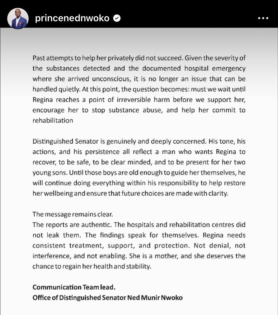 Senator Ned Nwoko has said that a medical report that went viral some days ago claiming that his wife, Regina, abused a number of drugs is genuine and that the hospital did not leak them. During the week, a medical report from an Abuja-based hospital made the rounds on social media. Regina had threatened to sue the hospital after the document went viral but the hospital later released a statement saying it never released the document to the public. The medical report had listed a number of drugs she reportedly abused. Her brother, Lawrence, had even come out to say that the medical report was fake. However, in a statement released today November 15, Nwoko speaking through his media team said the medical report is genuine. He mentioned that the medical report confirmed presence of hard drugs like Marijuana, Cocaine, Morphine, Opiates of extreme ly elevated levels and alcohol at a critically dangerous level, in her system. He said that the report also mentioned that on October 3, she was brought in unconscious after suffering a drug overdose. He added that the hospital suffered several challenges in rehabilitating her including interference from her siblings who he claimed saw no reason in offering her alcohol and weed even while she is undergoing rehabilitation. Ned in the statement signed by his Communication team said that he has persistently called for her rehabilitation because he believes that the decisions she has taken in recent times were not from a stable state of mind. He said he is determined to get Regina the help she needs so she can take care of her two boys. The post Viral Medical report about Regina Nwokos drug abuse is true – Ned Nwoko appeared first on Linda Ikeji Blog.