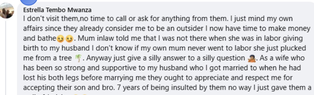 A Zambian woman, Estrella Tembo Mwanza, has revealed that her in-laws consider her as an outsider despite marrying her husband after he lost his legs. She disclosed this on Saturday, November 15 after a Nigerian woman asked how women can avoid conflicts with their in-laws. She added that instead of appreciation and respect for marrying their physically challenged son, they have been insulting her for seven years. I don’t visit them, no time to call or ask for anything from them. I just mind my own affairs since they already consider me to be an outsider. I now have time to make money and bathe, she wrote. “Mum in-law told me that I was not there when she was in labor giving birth to my husband I don’t know if my own mum never went to labor she just plucked me from a tree. Anyway just give a silly answer to a silly question. As a wife who has been so strong and supportive to my husband who I got married to when he had lost his both legs before marrying me, they ought to appreciate and respect me for accepting their son and bro. 7 years of being insulted by them, no way I just gave them a wall of Jericho.