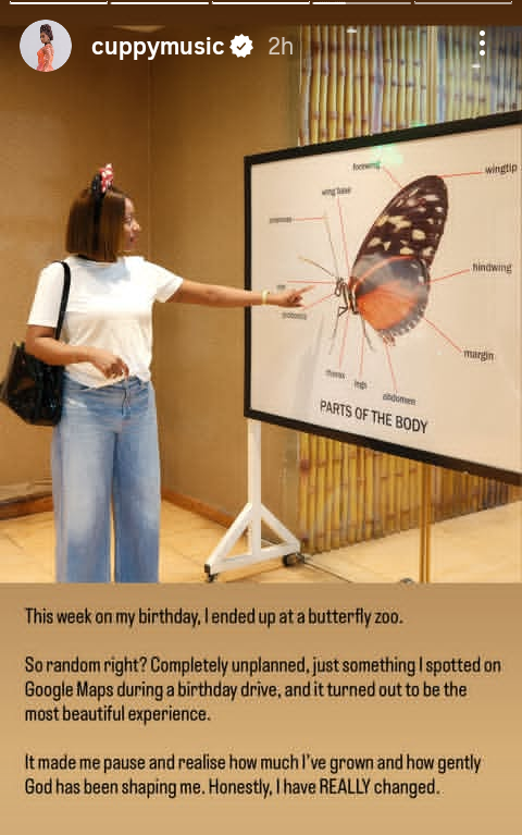 Nigerian disc jockey, Florence Otedola, aka DJ Cuppy, who turned 33 recently has reflected on her journey and personal growth with introspection, saying she is choosing intention over noise.  The billionaire daughter said her past birthday celebrations were good but ever since turning 30, her heart and soul have been craving substance over flash.  For years my birthdays were loud. Both popping, crowded rooms, strangers everywhere, celebrations that looked lit but never felt right. Since turning 30, my heart and soul has been craving something deeper she wrote. As I step into this new age, I m choosing intention over noise and choosing a life that feels aligned with who I m becoming.” This year, she celebrated her birthday quietly at a butterfly zoo, acknowledging that she has changed for the better So random right? Completely unplanned, just something I spotted on Google Maps during a birthday drive, and it turned out to be the most beautiful experience. It made me pause and realise how much I ‘ve grown and how God has been shaping me. Honestly, I have really changed.   The post As I step into this new age, I m choosing intention over noise – DJ Cuppy reflects on her life, growth and past birthday celebrations appeared first on Linda Ikeji Blog.