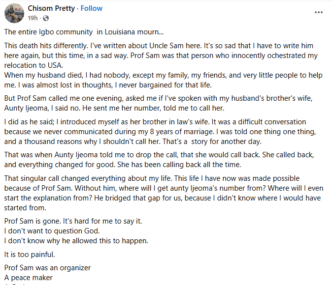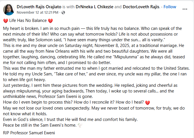 A 29-year-old Nigerian man, Chukwuebuka Eweni is in custody after he stabbed his 75-year-old father, Samuel Eweni to d3ath and injured his two sisters in New Orleans, Louisiana, US. Family members confirmed to WWL Louisiana that the deceased was was a computer sciences professor at Southern University at New Orleans. Relatives say Eweni and his two daughters were st@bbed on Tuesday night, November 11, 2025. One of the victims was released from the hospital, the other is still being treated as of Wednesday afternoon and is expected to survive. Family members say Eweni has long suffered from mental illness but has never been violent. They described Tuesday evening as an ordinary night at their home on Pebble Drive before Eweni grabbed a knife. They say they dont know what set him off. After the stabbing, family members say they found out Eweni went to New Orleans East Hospital, where he would routinely check himself in for mental help. Without knowing anything about the crime, family members say the hospital transferred him to a facility in Jefferson Parish. Thats where he was tracked down and taken into custody Wednesday morning. On Wednesday afternoon, SUNO released the following statement about Samuel Eweni’s death. “Dr. Eweni was more than an educatorhe was a mentor and a guiding light to so many of our students, said Dr. Joseph Bouie, Jr., Chancellor of Southern University at New Orleans. His contributions to the College of Business and Public Administration and to the universitys mission of transforming lives through education will be remembered and celebrated. Our hearts are with his family, friends, and colleagues during this deeply difficult time.” The New Orleans Police Department in a statement confirmed that Chukwuebuka Eweni now faces one count of second-degree m8rder and two counts of attempted second-degree m8rder. The NOPD has obtained an arrest warrant for Chukwuebuka Eweni (pictured, black male, DOB; 09-23-1998) in its investigation of a homicide that occurred on the evening of November 11, 2025, in the 8000 block of Pebble Street that also left two additional victims injured, the statement read. “At about 9:59 p.m., NOPD Seventh District officers responded to the location to investigate a reported aggravated battery by cutting believed to be domestic in nature. “Upon arrival, officers located inside of a residence an unresponsive adult male subject who had sustained at least one fatal stab wound and two other adult victims with stab wounds. “The two surviving victims were transported to a local area hospital where they are being treated for their injuries. Through investigation, NOPD Homicide Section detectives have developed and positively identified Eweni as the perpetrator in this incident and have obtained an arrest warrant on one count of second-degree murder and two counts of attempted second-degree m8rder.”