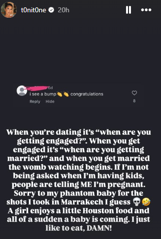 British-Nigerian author, Toni Tone has womb-watchers speculating that she is pregnant. Toni and her husband, Taye, got married in September 2025. The writer became the centre of social media chatter after she shared a video as well as photos from a recent trip on Instagram, with some people saying she is spotting a visible baby bump. She took to her Instagram story on Sunday to put the rumours to rest, saying she is just a girl who likes to eat. When you are dating, it’s when are you getting engaged?”. When you get engaged it’s when are you getting married? and when you get married the womb watching begins,” she wrote. If I m not being asked when I m having kids, people are telling me I m pregnant. Sorry to my phantom baby for the shots I took in Marrakech I guess. A girl enjoys a little Houston food and all of a sudden a baby is coming. I just like to eat, Damn.”