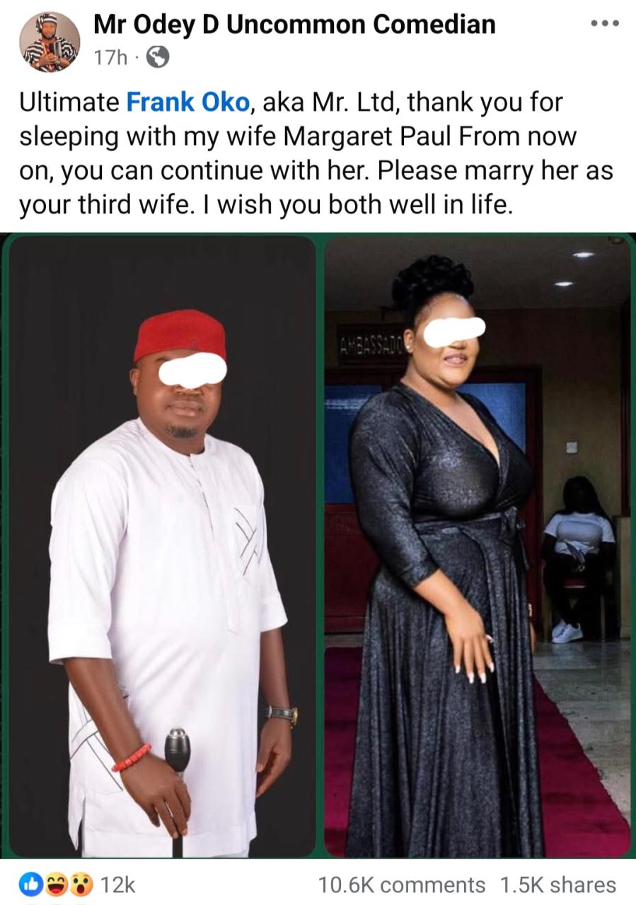 A comedian is trending on Faceboo after he called out his wife and the man’s she’s allegedly cheating on him with. The comedian, known as Mr Odey D Uncommon, took to Facebook to share a photo of his wife and her alleged lover whom he named as Mr Frank Oko. He even went as far as tagging the man. In the caption, the comedian wrote: “Ultimate Frank Oko, aka Mr. Ltd, thank you for sleeping with my wife Margaret Paul From now on, you can continue with her. Please marry her as your third wife. I wish you both well in life.”