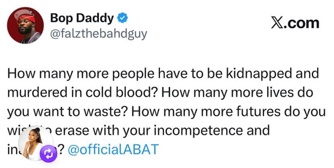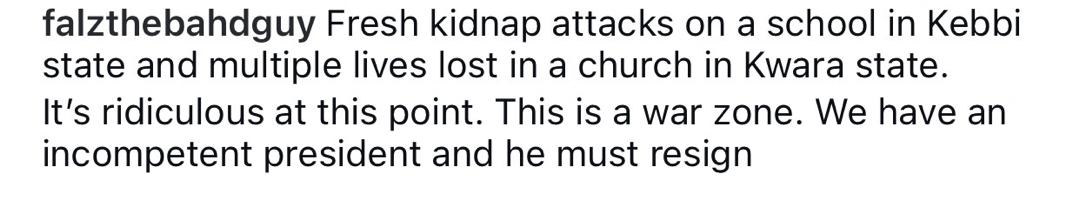 Following the increasing spate of insecurity across the country, rapper, Folarin Falana aka Falz, has called for the resignation of President Tinubu. In a post shared on X, Falz asked the President to vacate his seat following the several k!dnapping and k!llings in the country. He said the President has consistently shown his unwillingness to protect the lives of Nigerians and asked him to resign now. Read his tweets below