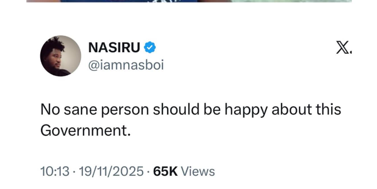 Comedian Nasboi has voiced his frustration with the state of the country, saying no sane person should feel satisfied with the current government. The entertainer shared the blunt remark on X, where it quickly gained traction and drew reactions from Nigerians who echoed similar sentiments about hardship, insecurity and governance challenges. See his tweet below The post No sane person should be happy about this government – Comedian Nasboi appeared first on Linda Ikeji Blog.