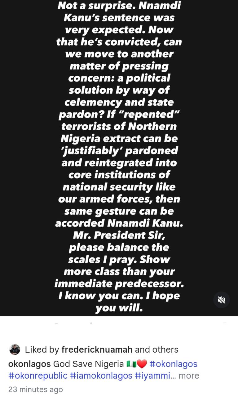 Nollywood actor, Imeh Bishop Umoh, better known as Okon Lagos, has called for the pardon of Nnamdi Kanu after the leader of the Indigenous People of Biafra (IPOB) was sentenced to life imprisonment. Kanu was sentenced today, Nov. 20, after being convicted on seven terrorism charges. Reacting to the sentencing, Okon Lagos stated that if terrorists of northern extraction who have taken many lives can be pardoned because the claim to be “repentant”, then Nnamdi Kanu should also be pardoned. Okon Lagos wrote: “Not a surprise. Nnamdi Kanu’s sentence was very expected. Now that he’s convicted, can we move to another matter of pressing concern: a political solution by way of clemency and state pardon? “If “repented” terrorists of Northern Nigeria extract can be “justifiably’ pardoned and reintegrated into core institutions of national security like our armed forces, then same gesture can be accorded Nnamdi Kanu. “Mr. President Sir, please balance the scales I pray, Show more class than your immediate predecessor. I know you can. I hope you will.” “God save Nigeria,” Okon added in the caption of his post.