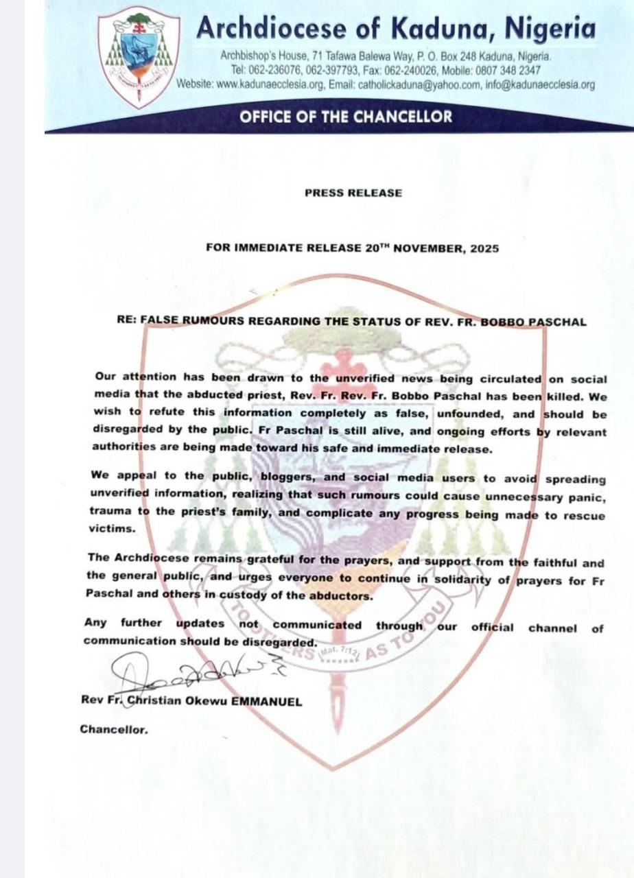 The Archdiocese of Kaduna has dismissed rumours circulating on social media that the kidnapped Catholic priest, Rev. Fr. Bobbo Paschal, has been k!lled by his abductors. The parish priest of St. Stephen Parish of the Catholic Church in Kushe Gugbu, Kagarko Local Government Area was abducted by terrorists on Monday, November 17, 2025. The attackers armed men stormed the community and forcefully took the priest from his residence. One person was k!lled during the raid, while several other residents were also abducted. In a statement issued on Thursday, November 20, the Chancellor of the Archdiocese Rev. Fr. Christian Okewu Emmanuel, described the news as false and unfounded. He appealed to the public, bloggers, and social media users to avoid spreading unverified information. According to the statement, such rumours could cause unnecessary panic to the priest’s family and complicate rescue efforts. The Archdiocese remains grateful for the prayers and support from the faithful and the general public, and urges everyone to continue in solidary of prayers for Fr. Paschal and others in custody of the abductors, the statement read. Any further updates not communicated through our official channel of communication should be disregarded.
