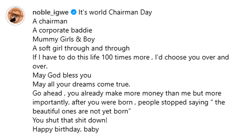 Nigerian media personality, Noble Igwe, has revealed that his wife makes more money than him. He disclosed this in a birthday message to his wife on Thursday, November 20, 2025. “Its World Chairman Day. A chairman. A corporate baddie. Mummy Girls & Boy. A soft girl through and through. If I have to do this life 100 times more , Id choose you over and over. May God bless you. May all your dreams come true,” he wrote. Go ahead , you already make more money than me but more importantly, after you were born , people stopped saying the beautiful ones are not yet born You shut that shit down! Happy birthday, baby. This comes a few weeks after he stated that one of the reasons he has not relocated abroad is his concern that his wife would get a job faster and earn more than him.