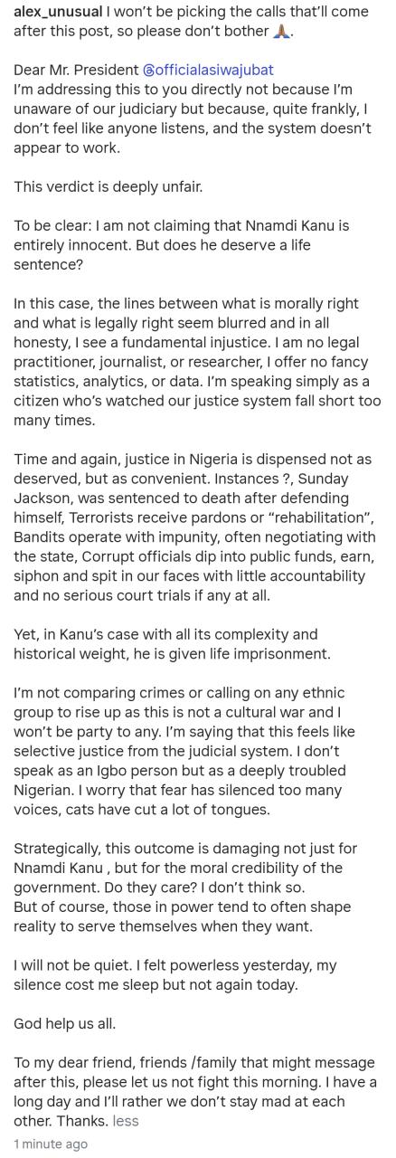 Alex Amuche Asogwa, better known as Alex Unusual, has condemned the sentence handed to Nnamdi Kanu, leader of the separatist group, Indigenous People of Biafra (IPOB). Nnamdi Kanu was yesterday, Nov. 20, sentenced to life imprisonment after being convicted on seven terrorism related charges. In an open letter to President Bola Tinubu, Alex stated that the verdict is unfair. She pointed out that terrorists in Nigeria have been known to negotiate with the government and are often granted pardon. She further pointed out that corrupt officials get away with stealing from the public coffers. She then questioned why Nnamdi Kanu’s case, “with all its complexity and historical weight”, resulted in a life sentence. “I’m saying this feels like selective justice from the judicial system,” Alex wrote. See her full post below.