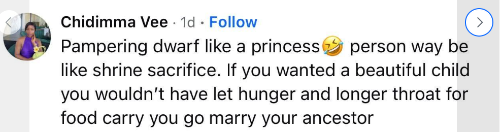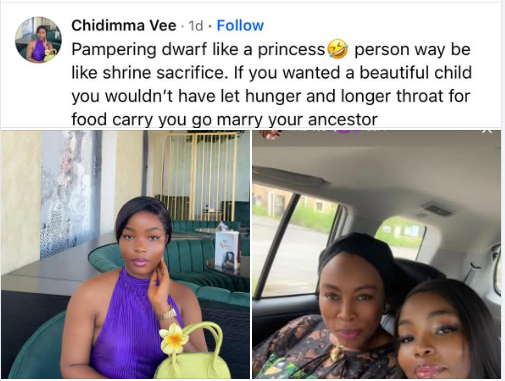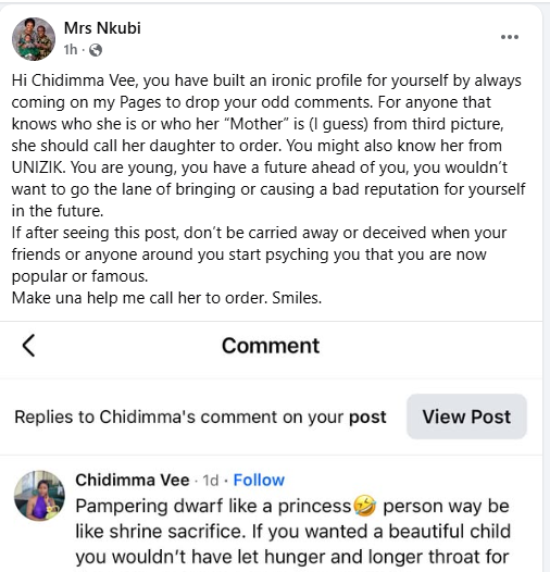 Vivian Joseph, wife of popular diminutive actor/skit maker, Victor Nkubi, has called out one Vivian, over a vile comment about her daughter. In a Facebook post on Monday, Mrs Nkubi shared a screenshot of the lady with her mother alongside a screenshot of the comment, mocking her and her daughter. Pampering dwarf like a princess. Person wey be like shrine sacrifice. If you wanted a beautiful child you wouldn’t have let hunger and longer throat for food carry you go marry your ancestor, Vivian wrote. Reacting to the comment, Mrs Nkubi, wrote: “Chidimma Vee, you have built an ironic profile for yourself by always coming on my Pages to drop your odd comments. For anyone that knows who she is or who her Mother is (I guess) from third picture, she should call her daughter to order. You might also know her from UNIZIK. You are young, you have a future ahead of you, you wouldnt want to go the lane of bringing or causing a bad reputation for yourself in the future. If after seeing this post, dont be carried away or deceived when your friends or anyone around you start psyching you that you are now popular or famous. Make una help me call her to order.”