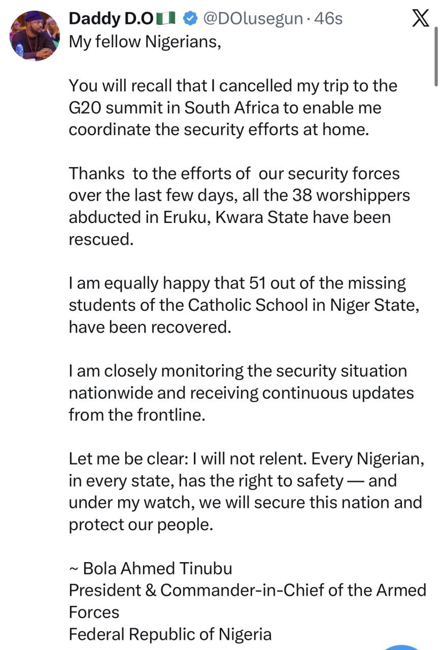 All 38 church members abducted in Kwara have regained ther freedom – President Tinubu