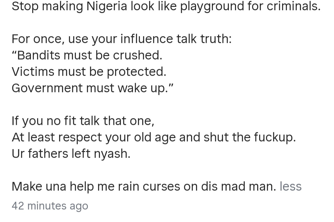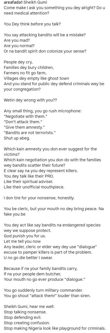Charley Boy has blasted Sheikh Ahmed Gumi for stating that attacking bandits is not the solution to insecurity, rather they should be negotiated with.  In a video shared by Charley Boy, whose real name is Charles Oputa, Gumi is seen speaking about bandits.  The Islamic cleric from Northern Nigeria stated that the US attacking bandits will only lead to more chaos. He said attacking bandits will be a “mistake”. He suggested instead that bandits should be listened to, negotiated with, and included in the budget. Reacting, Charley Boy, aka Area Fada, wrote; “Sheikh Gumi, Come make I ask you something you dey alright? Do u need medical attention? “You Dey think before you talk? “You say attacking bandits will be a mistake? Are you mad? Are you normal? Or na bandit spirit don colonize your sense? “People dey cry, Families dey bury children, Farmers no fit go farm, Villages dey empty like ghost town  And you stand for public dey defend criminals wey be your congregation? “Wetin dey wrong with you?? “Any small thing, you go rush microphone:’Negotiate with them.’ ‘Dont attack them.’ ‘Give them amnesty.’ ‘Bandits are not terrorists.’ Shut up abeg. “Which kain amnesty you don ever suggest for the victims? Which kain negotiation you don do with the families wey bandits scatter their future? E clear say na you dey represent k!llers. “You dey talk like their PRO. Like their spiritual adviser. Like their unofficial mouthpiece. “I don tire for your nonsense, honestly. You be cleric, but your mouth no dey bring peace. Na fake you be “You dey act like say bandits na endangered species wey we suppose protect. “God punish you for us.”Let me tell you now  Any leader, cleric or elder wey dey use ‘dialogue’ excuse to pamper k!llers is part of the problem.U no go di better I swear. “Because if na your family bandits carry,If na your people dem butcher, Your mouth no go ever produce ‘dialogue.’ “You go suddenly turn military commander.You go shout ‘attack them!’ louder than siren. “Sheikh Gumi, hear me well: Stop talking nonsense. Stop defending evil. Stop creating confusion. Stop making Nigeria look like playground for criminals. “For once, use your influence talk truth: ‘Bandits must be crushed. Victims must be protected. Government must wake up.’ “If you no fit talk that one, At least respect your old age and shut the fuckup. Ur fathers left nyash. “Make una help me rain curses on dis mad man.”  See video below.      View this post on Instagram           A post shared by Lindaikejiblog (@lindaikejiblogofficial) The post Charley Boy blasts Sheikh Gumi for stating that “attacking bandits will be a mistake” appeared first on Linda Ikeji Blog.