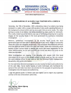 Authorities in Bekwarra Local Government Area of Cross River State have begun an intensive investigation into a disturbing viral video showing an elderly man enclosed in a casket alongside a c0rpse.  The video, which surfaced online on November 19, 2025, shows the elderly man being assaulted by a group of youths while voices speaking the Bekwarra language were heard in the background.  It was gathered that the youths forced the man into the coffin after accusing him of witchcraft and k!lling the deceased.  They insisted that if he did not confess to the allegation, he would be buried alongside the corpse. The disturbing incident triggered public outrage and widespread condemnation.  In a statement signed by the Acting Chairman of Bekwarra Local Government Area, Hon. Egbung, Odama Egbung, said he immediately contacted all security heads across the local government after the footage began circulating.  According to him, the brutality seen in the video prompted urgent action to verify the authenticity of the recording and identify the individuals involved.  He said preliminary investigations by all security heads across the local government have not been able to identify the particular ward, village or community where the scene was allegedly perpetrated.  He instructed the Ward Relations Officers of all the political wards to liaise with their clan heads, chiefs and community youth leaders in their various wards to identify the victim and those responsible for the video.  The Acting Chairman noted that they are yet to identify the victim and where the scene on the video was recorded.  While investigations are ongoing, he appealed to the public with first hand information on the scene of the alleged assault to kindly speak up while urging residents to contact the ward relations officer in their various wards or visit the Divisional Police Headquarters, Abuochiche with useful information.  Also, forensic investigators are also tracing the source and authenticity of the said video.  Social media handles of some individuals who shared the content are said to be have been documented for the purposes of questioning and investigation into the source and authenticity.  The public are urged to remain calm and vigilant and to report any suspicious activity to the law enforcement authorities.  The post Elderly man forced into coffin with c0rpse after being accused of k!lling the deceased through witchcraft in Cross River community (video) appeared first on Linda Ikeji Blog.