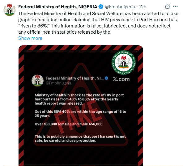 The Federal Ministry of Health and Social Welfare has debunked a viral claim suggesting that HIV prevalence in Port Harcourt has reached 86 percent. In a statement released on social media, the Ministry said the viral statistic is entirely false and does not reflect official health data. It stated that no State in Nigeria has an HIV prevalence rate anywhere near the figure cited in the graphic circulating online. Officials stressed that the Ministry has not issued any advisory resembling the viral post and that the format, wording, and numbers in the claim do not align with official communications. The Ministry dismissed the viral report and directed the public to the National AIDS and STIs Control Programme (NASCP), the National Agency for the Control of AIDS (NACA), and official Ministry publications for verified data.