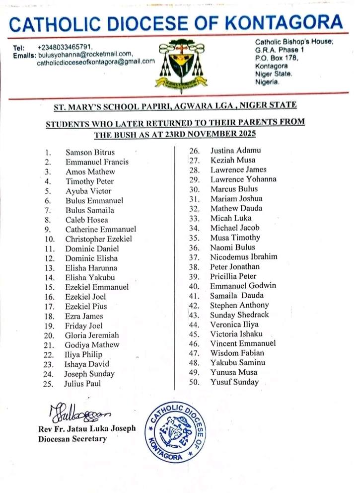 The chairman of Agwara Local Government Council, Niger State, Hon. Iliyasu Zakari and the Catholic Diocese of Kontagora have released the names of 50 of the abducted students from St. Marys Catholic Private School, Papiri, who escaped from captivity. Armed men attacked the school in the early hours of Friday, shooting a security guard and abducting more than 289 pupils and 14 students, along with 12 teaching and non-teaching staff. Earlier, the Christian Association of Nigeria (CAN) in Niger State said 50 students abducted from the school have escaped Bello Gidi, the Chief Press Secretary to the chairman, who confirmed the development in a statement on Sunday said the students have reunited with their parents. This encouraging development brings relief to the community, and we appreciate the efforts of the security agencies, local vigilantes, and community members who have been working tirelessly since the incident occurred, the statement read. “Hon. Iliyasu Zakari, expresses deep gratitude to God for the safety of the children and assures the public that every necessary step is being taken to secure the release of the remaining students. The Council remains fully committed to supporting security operations until all abducted children are safely returned home. We also call on residents to remain calm, cooperate with authorities, and report any useful information that can assist ongoing rescue efforts. The Catholic Diocese of Kontagora in a statement signed by its secretary, Rev. Fr. Jatua Luka Joseph, said the students escaped between Friday and Saturday. They did not report back to the school; instead, we were able to confirm their safe return home during follow-up visits and calls from their families, the statement added.