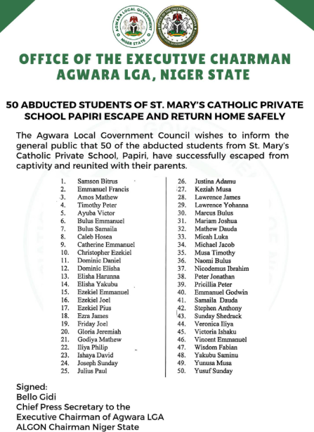 The chairman of Agwara Local Government Council, Niger State, Hon. Iliyasu Zakari and the Catholic Diocese of Kontagora have released the names of 50 of the abducted students from St. Marys Catholic Private School, Papiri, who escaped from captivity. Armed men attacked the school in the early hours of Friday, shooting a security guard and abducting more than 289 pupils and 14 students, along with 12 teaching and non-teaching staff. Earlier, the Christian Association of Nigeria (CAN) in Niger State said 50 students abducted from the school have escaped Bello Gidi, the Chief Press Secretary to the chairman, who confirmed the development in a statement on Sunday said the students have reunited with their parents. This encouraging development brings relief to the community, and we appreciate the efforts of the security agencies, local vigilantes, and community members who have been working tirelessly since the incident occurred, the statement read. “Hon. Iliyasu Zakari, expresses deep gratitude to God for the safety of the children and assures the public that every necessary step is being taken to secure the release of the remaining students. The Council remains fully committed to supporting security operations until all abducted children are safely returned home. We also call on residents to remain calm, cooperate with authorities, and report any useful information that can assist ongoing rescue efforts. The Catholic Diocese of Kontagora in a statement signed by its secretary, Rev. Fr. Jatua Luka Joseph, said the students escaped between Friday and Saturday. They did not report back to the school; instead, we were able to confirm their safe return home during follow-up visits and calls from their families, the statement added.