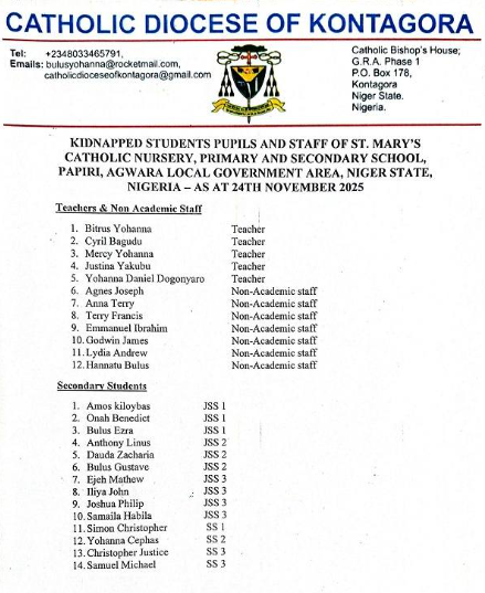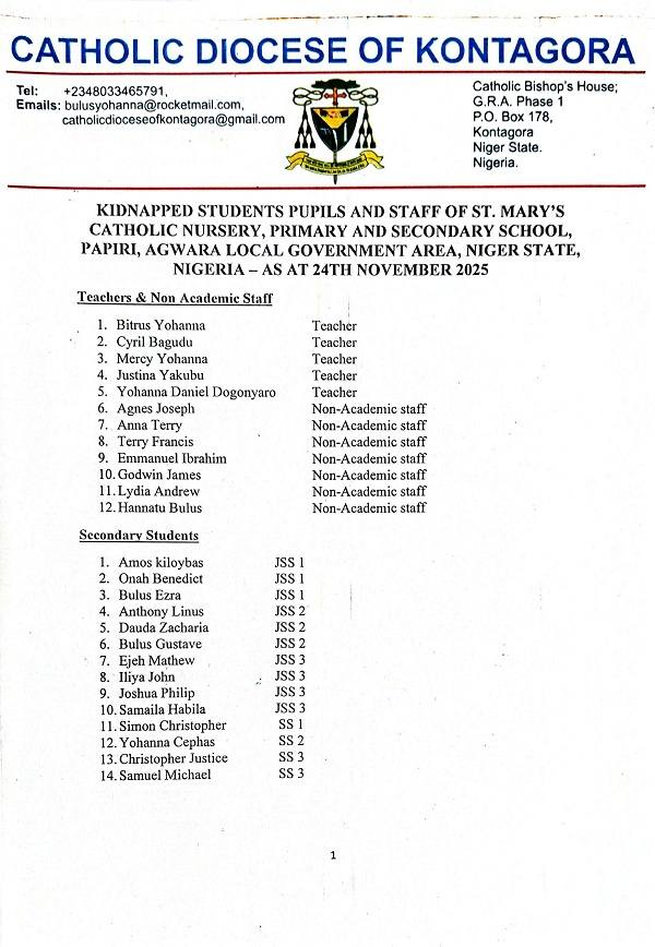 The Catholic Diocese of Kontagora in Niger State has published the names of 265 students, pupils and staff and teachers of St. Marys Catholic School, Papiri, Agwara LGA, who are still in captivity.  Bandits attacked the school on November 21, 2025 and kidnapped 315 people, including 303 students and 12 teachers  The Christian Association of Nigeria (CAN) in Niger State, the Diocese and the Local Government Council on Sunday, November 23, confirmed that 50 students had managed to escape from abductors.  The diocese confirmed on Monday that 239 nursery and primary pupils, 14 secondary school students, and 12 teachers remain in captivity, making a total of 265 people.  It also released the full list of those who are yet to regain their freedom. Here is the list below:   The post Update: Names of 265 Niger State Catholic school pupils, students and staff still in captivity appeared first on Linda Ikeji Blog.
