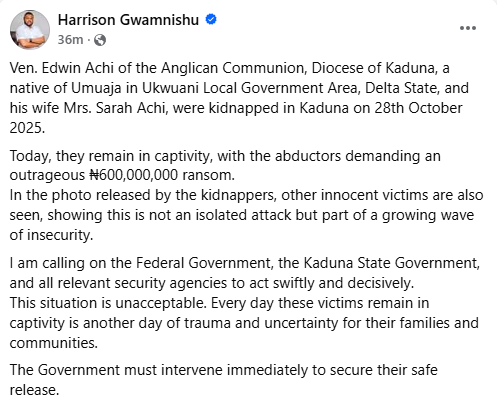 Bandits have released the photos of abducted Kaduna Anglican priest, Ven. Edwin Achi and his wife, Sarah.   LIB reported that bandits invaded Nissi community in Chikun Local Government Area of the state on October 28, 2025, kidnapping the couple from their residence.   The kidnappers later contacted the family, demanding what they described as an outrageous ransom.  Activist Harrison Gwamnishu, who shared photos of the couple and other victims in captivity, said the kidnappers are demanding N600m as ransom .  He appealed to the Federal Government and relevant security agencies to intensify efforts to secure their release. “Ven. Edwin Achi of the Anglican Communion, Diocese of Kaduna, a native of Umuaja in Ukwuani Local Government Area, Delta State, and his wife Mrs. Sarah Achi, were kidnapped in Kaduna on 28th October 2025. Today, they remain in captivity, with the abductors demanding an outrageous N600,000,000 ransom,” he wrote.  “In the photo released by the kidnappers, other innocent victims are also seen, showing this is not an isolated attack but part of a growing wave of insecurity. “I am calling on the Federal Government, the Kaduna State Government, and all relevant security agencies to act swiftly and decisively.This situation is unacceptable.  “Every day these victims remain in captivity is another day of trauma and uncertainty for their families and communities. The Government must intervene immediately to secure their safe release.”     The post Bandits release photos of abducted Kaduna Anglican priest and his wife after demanding N600m ransom appeared first on Linda Ikeji Blog.