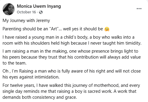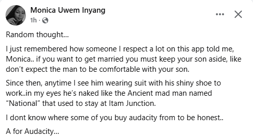 A Nigerian lady, Monica Uwem Inyang, has recalled when someone she highly respects told her to keep aside her 12-year-old son if she wants to get married. Inyang, who disclosed this in a Facebook post on Tuesday, November 25, 2025 said the person went on to tell her that she shouldnt expect a man to be comfortable with her son. Random thought I just remembered how someone I respect a lot on this app told me, Monica.. if you want to get married you must keep your son aside, like dont expect the man to be comfortable with your son, she wrote. “Since then, anytime I see him wearing suit with his shiny shoe to work..in my eyes hes naked like the Ancient mad man named National that used to stay at Itam Junction. I don’t know where some of you buy audacity from to be honest. A for Audacity.