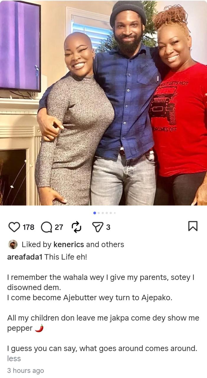 Charles Oputa, aka Charley Boy or Area Fada, has revealed that his children are now doing to him what he did to his parents. The entertainer admitted that he gave his parents grief and even “disowned” them at some point. Now, he says his children are showing him “pepper”. He wrote: “This Life eh! I remember the wahala wey I give my parents, sotey Idisowned dem. “I come become Ajebutter wey turn to Ajepako. All my chilidren don leave me jakpa come dey show me pepper. “I guess you can say, what goes around comes around.”