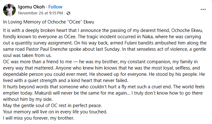 A commercial driver, Ochoche Otokolo Ekwu, d!ed after being struck by a stray bullet during an attempted kidnapping along the MakurdiKura road in Benue State. The incident occurred at about 6:30 p.m. on Wednesday, November 26, 2025 when a group of engineers travelling from Kura to Makurdi encountered armed men who had blocked the road, intending to abduct passengers in a bus ahead of them. According to security analyst Zagazola Makama, soldiers on routine patrol were behind the engineers vehicle and immediately engaged the attackers in a gun duel, forcing the assailants to flee into the bush. During the exchange of fire, Ekwu, the driver of the engineers vehicle, was hit by a stray bullet and d!ed on the spot. The Divisional Police Officer of D Division mobilised a patrol team alongside tactical units to the scene, where the corpse was evacuated and deposited at a mortuary in Makurdi. Security operatives are currently combing nearby bushes to track the fleeing suspects and prevent further attacks along the route.