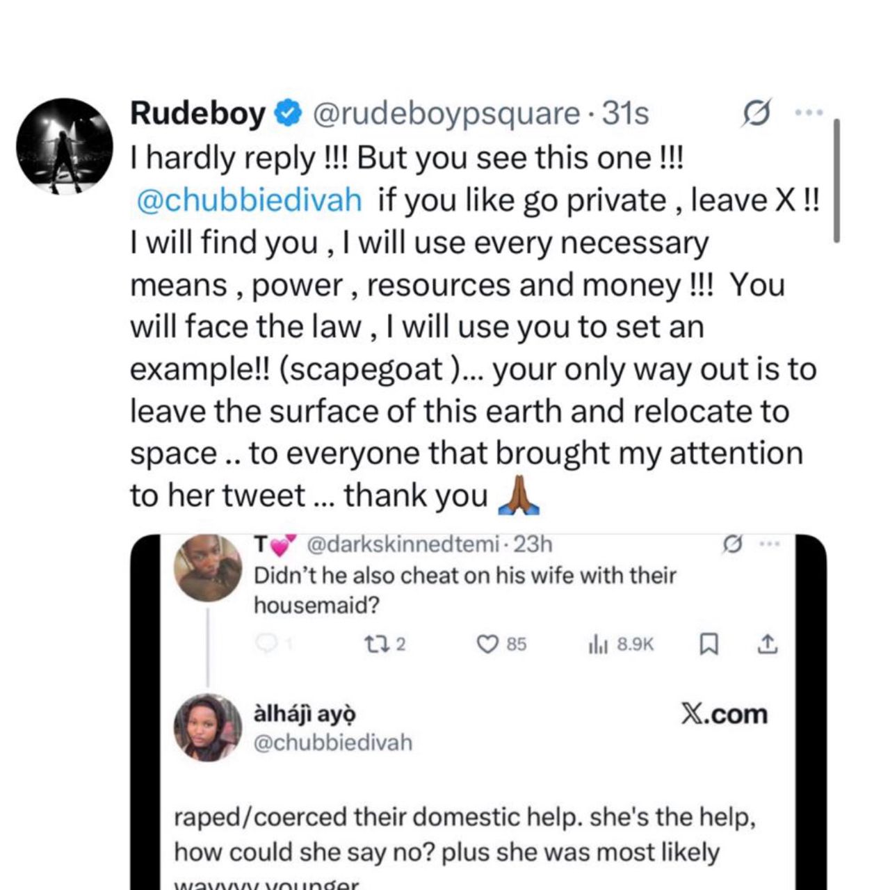 Paul Okoye aka Rudeboy has effected the arrest of a female X user, @chubbiediva who weeks back accused him of being a r@pist and abuser of a minor. It all started on September 23 when photos of Pauls wife, Ifeoma, was shared on X as she celebrated her 25th birthday. An X user then left a comment under a post, stating that Paul cheated on his former wife, Anita, with their maid. Reacting to the said comment, @chubbiediva alleged that Paul r@ped/coerced the maid. She further alleged that the singer sent his wife and sister in-law out of the house after he was caught. Well, some Nigerians saw the tweet and called on the singer to take action so as to clear his name. Paul at the time vowed to use everything within his power, to ensure the X user faces the law. True to his word, he effected her arrest and will be dragging her to court. An X user, @salako who pushed for the singer to ensure the X user faced the law, gave an update on his X handle this afternoon. According to the X user, the accuser fled the country after making the claim but was eventually arrested on November 6 and will be charged to court soon.